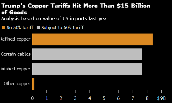 美国联邦公报周一公布了将被征收50%关税的清单。据测算,征税清单包括半制成品,如铜线、铜管和铜棒,这些产品去年进口额为77亿美元,还有通常用于电话或互联网连接的铜缆线产品,进口额达到类似水平。