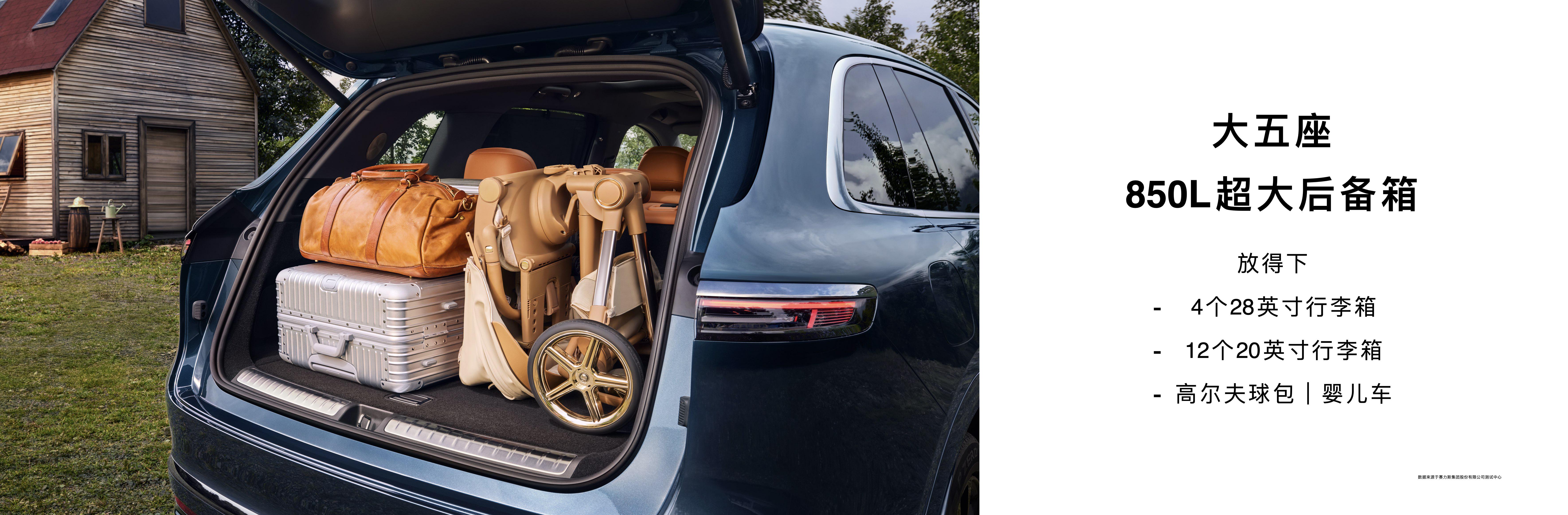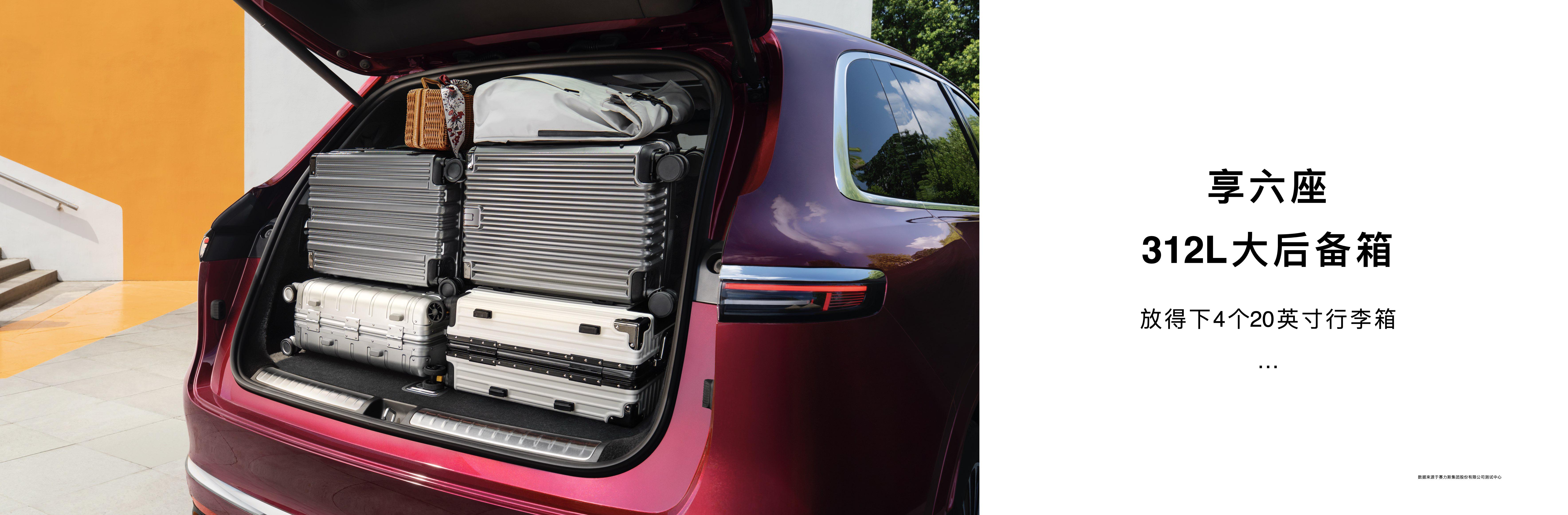 纯电版搭载145L前备箱,支持Knock Knock开启,车身可一键降低50mm,取物更轻松。大五座后备箱容积850L,可容纳4个28寸或12个20寸行李箱;六座拥有312L后备箱,可收纳4个20寸箱。