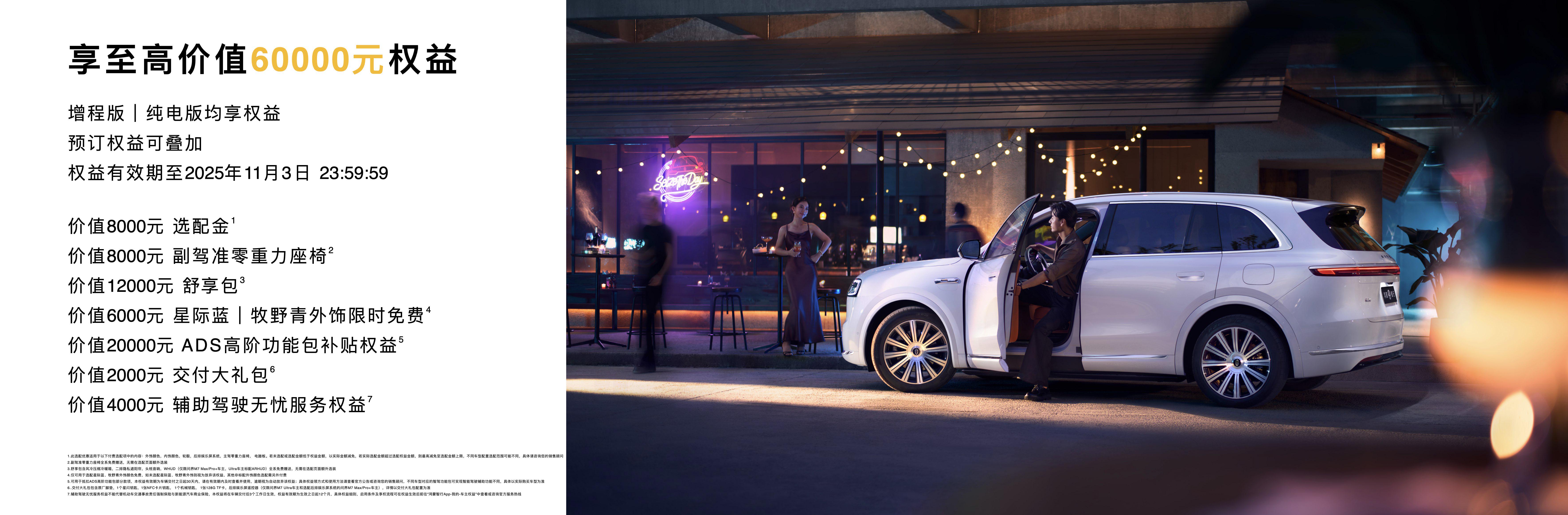 至高价值60000元首销权益:包含赠送价值8000元选配金、价值8000元副驾准零重力座椅、价值12000元舒享包;价值6000问界专属外饰星际蓝、牧野青限时免费;价值20000元ADS辅助驾驶功能包补贴、价值4000元ADS 4辅助驾驶无忧权益与价值2000元舒享用车大礼包等。老车主回馈权益:鸿蒙智行其他车型车主增购/换购可享10000元减免,问界非智驾版车主更享40000元减免。