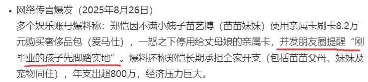 郑恺得知此事后,发了一条朋友圈:“刚毕业的孩子先脚踏实地”,还说郑恺承担了全家开支,包括苗苗父母、苗苗妹妹和宠物的,因为说的有鼻子有眼的,很多网友信以为真了。