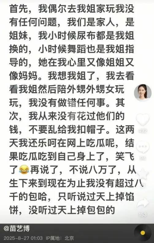 第二,苗艺博说自己从来没有花过姐姐和姐夫的钱,不要给她乱扣帽子。